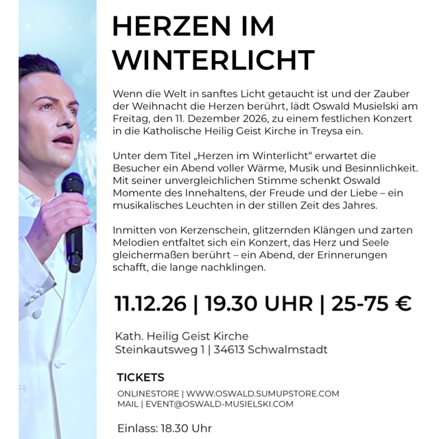 Wenn die Welt in sanftes Licht getaucht ist und der Zauber der Weihnacht die Herzen berührt, lädt Oswald Musielski am Freitag, den 11. Dezember 2026, zu einem festlichen Konzert in die Katholische Heilig Geist Kirche in Treysa ein.