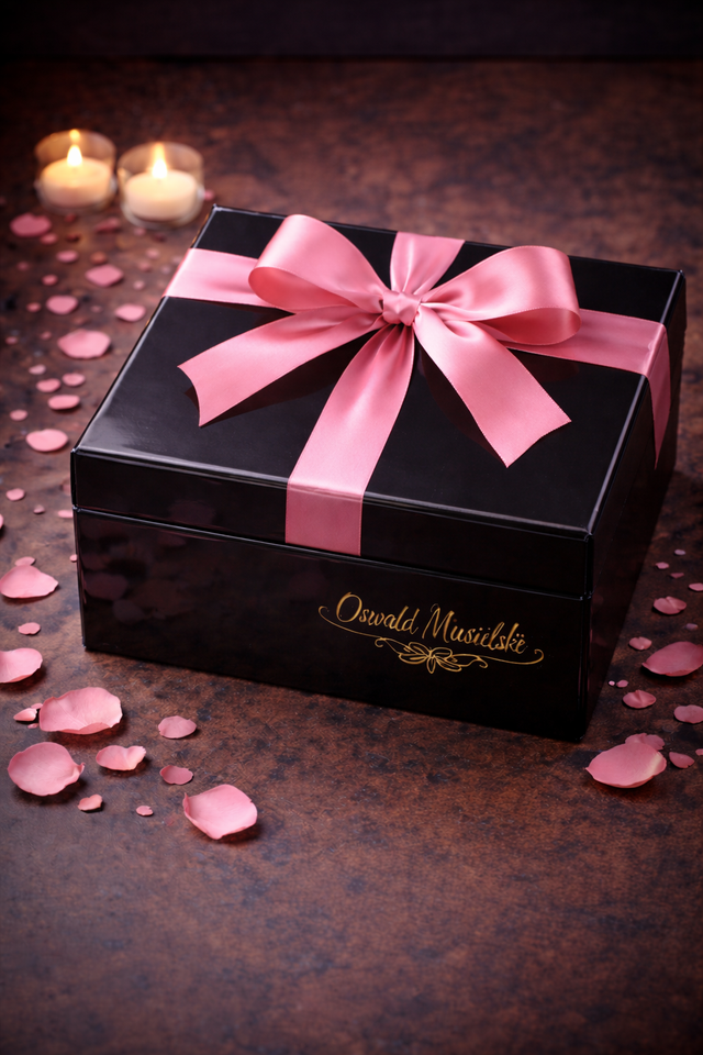 Unsere exklusive Muttertags-Box im edlen schwarzen Hochglanz-Lack ist vollständig mit einer roséfarbenen Satin-Schleife umschlossen und steht für zeitlose Eleganz.