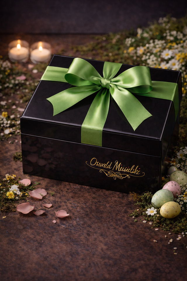 Unsere exklusive Oster-Geschenkbox im edlen schwarzen Hochglanz-Lack vereint festliche Eleganz mit zeitloser Wertigkeit. Vollständig umschlossen von einer hochwertigen grünen Satin-Schleife und veredelt mit dem goldenen Logo Oswald Musielski, ist diese Box ein stilvoller Blickfang.